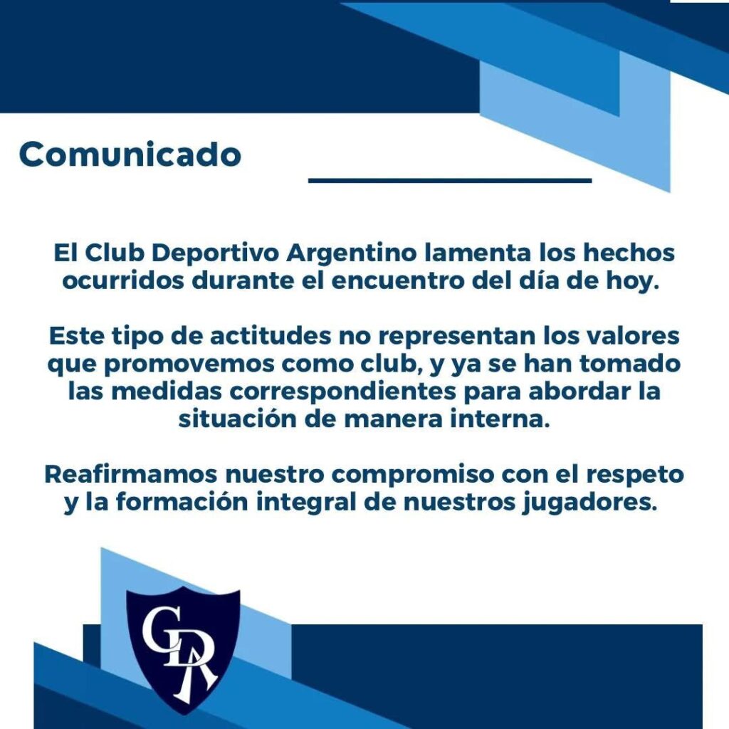 El Deportivo Argentino lamento la situación y expresó que “Este tipo de actitudes no representan los valores que promovemos como club”, al tiempo que informó en su misiva que “ya se han tomado las medidas correspondientes para abordar la situación de manera interna.”