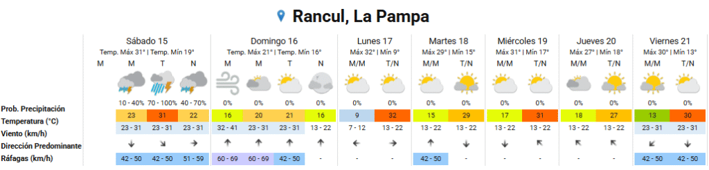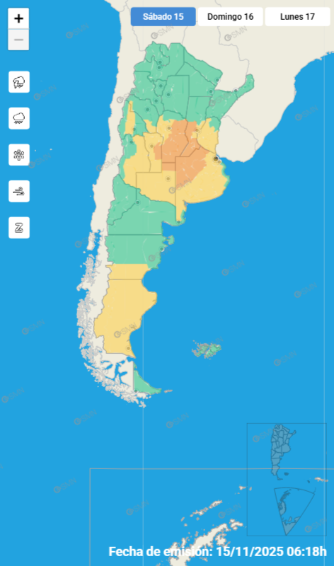 Según informó el SMN «El área será afectada por tormentas fuertes o localmente severas. Las mismas podrían provocar abundante caída de agua en cortos períodos, actividad eléctrica frecuente, y principalmente caída de granizo y ráfagas que pueden superar los 90 km/h. Se prevén valores de precipitación acumulada entre 40 y 80 mm, pudiendo ser superados de manera puntual».