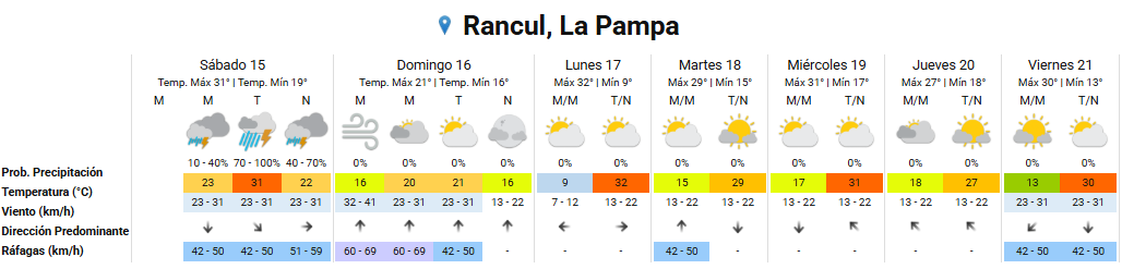 Según informó el SMN «El área será afectada por tormentas fuertes o localmente severas. Las mismas podrían provocar abundante caída de agua en cortos períodos, actividad eléctrica frecuente, y principalmente caída de granizo y ráfagas que pueden superar los 90 km/h. Se prevén valores de precipitación acumulada entre 40 y 80 mm, pudiendo ser superados de manera puntual».