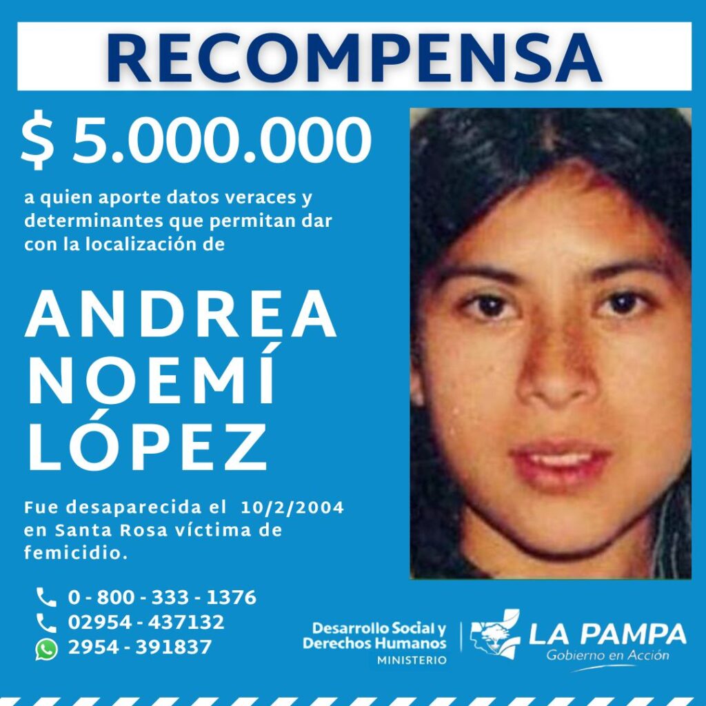 El gobernador Sergio Ziliotto firmó el decreto 1214/24 mediante el cual se aumenta a 5.000.000 de pesos la recompensa ofrecida a quien brinde datos concretos que logren localizar los restos de Andrea Noemí López, la joven víctima de femicidio y desaparecida el 10 de febrero de 2004.