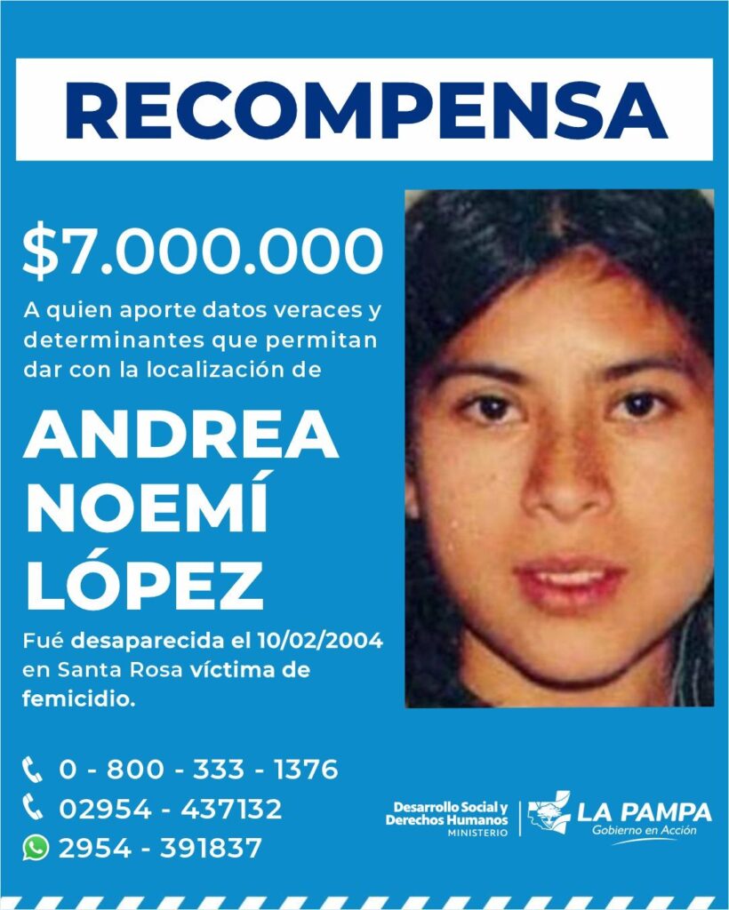El gobernador Sergio Ziliotto firmó el decreto mediante el cual se aumenta a $ 7.000.000 la recompensa ofrecida a quien brinde datos concretos que logren localizar los restos de Andrea Noemí López, la joven víctima de femicidio y desaparecida el 10 de febrero de 2004.
