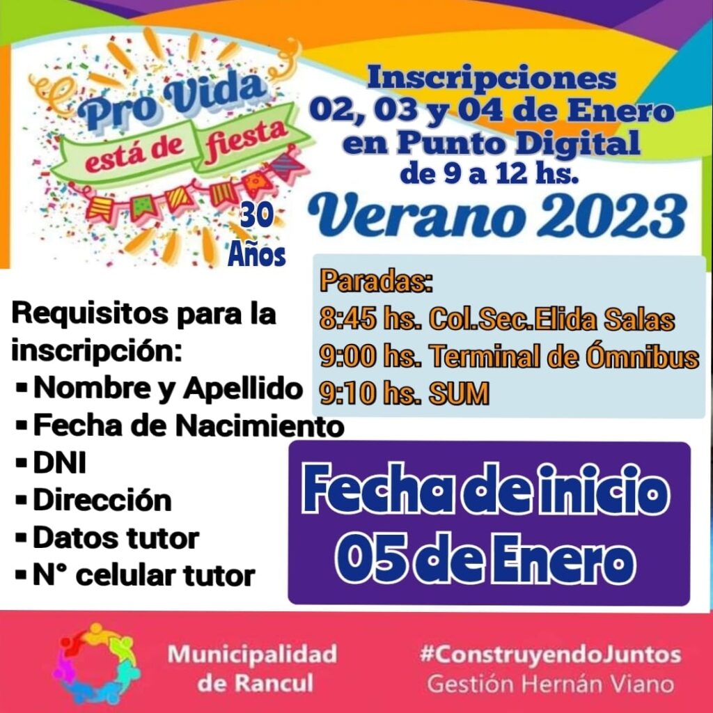 La Municipalidad de Rancul anunció el inicio de las inscripciones para el ProVida de Verano 2023. Las mismas se recepcionarán en el Punto Digital.