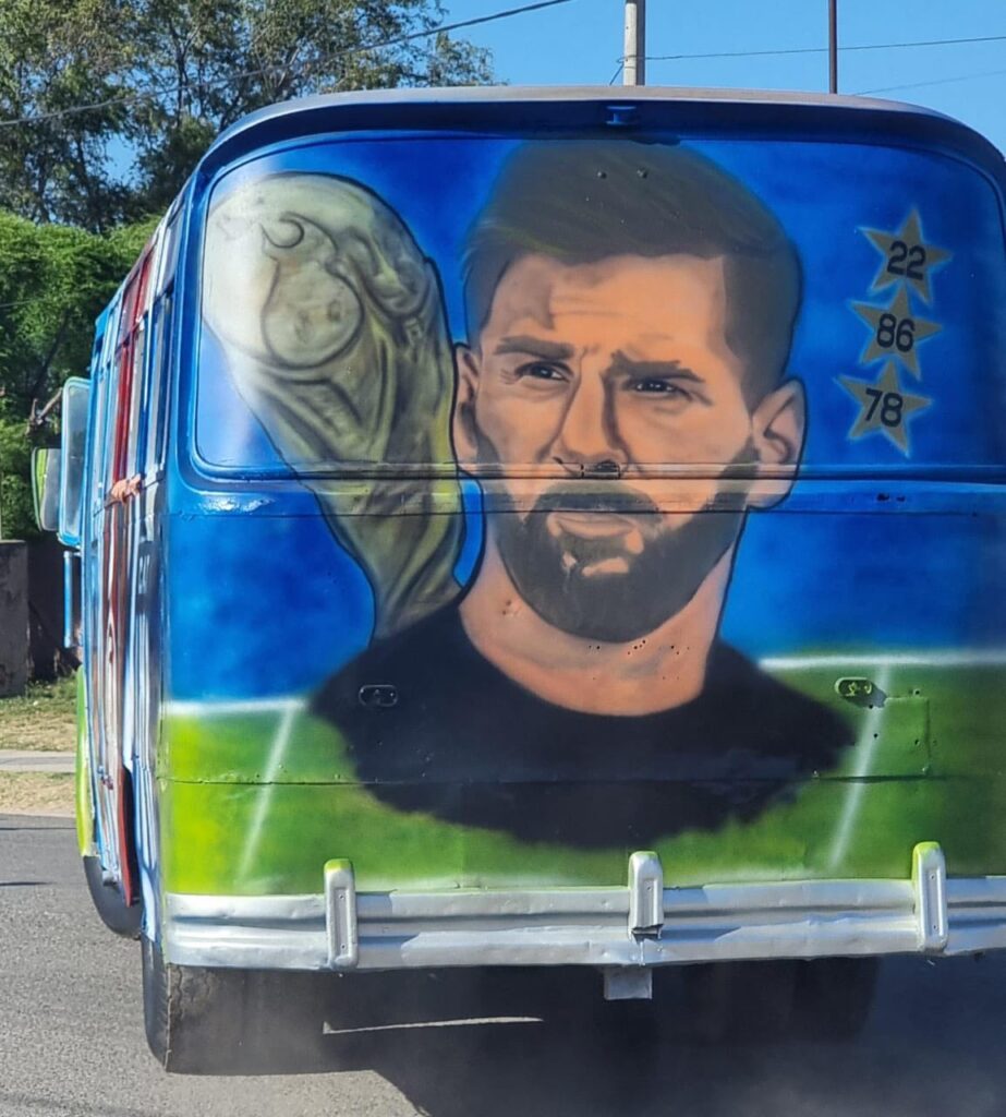 Este año tampoco pasó desapercibido el arte que desplegó Pablo Baras sobre el vehículo que se destaco por ser “La Scaloneta” años anteriores, y que ahora luce los escudos de los equipos de fútbol más importantes del país en su laterales, con un Lionel Messi que acompaña en la parte trasera.