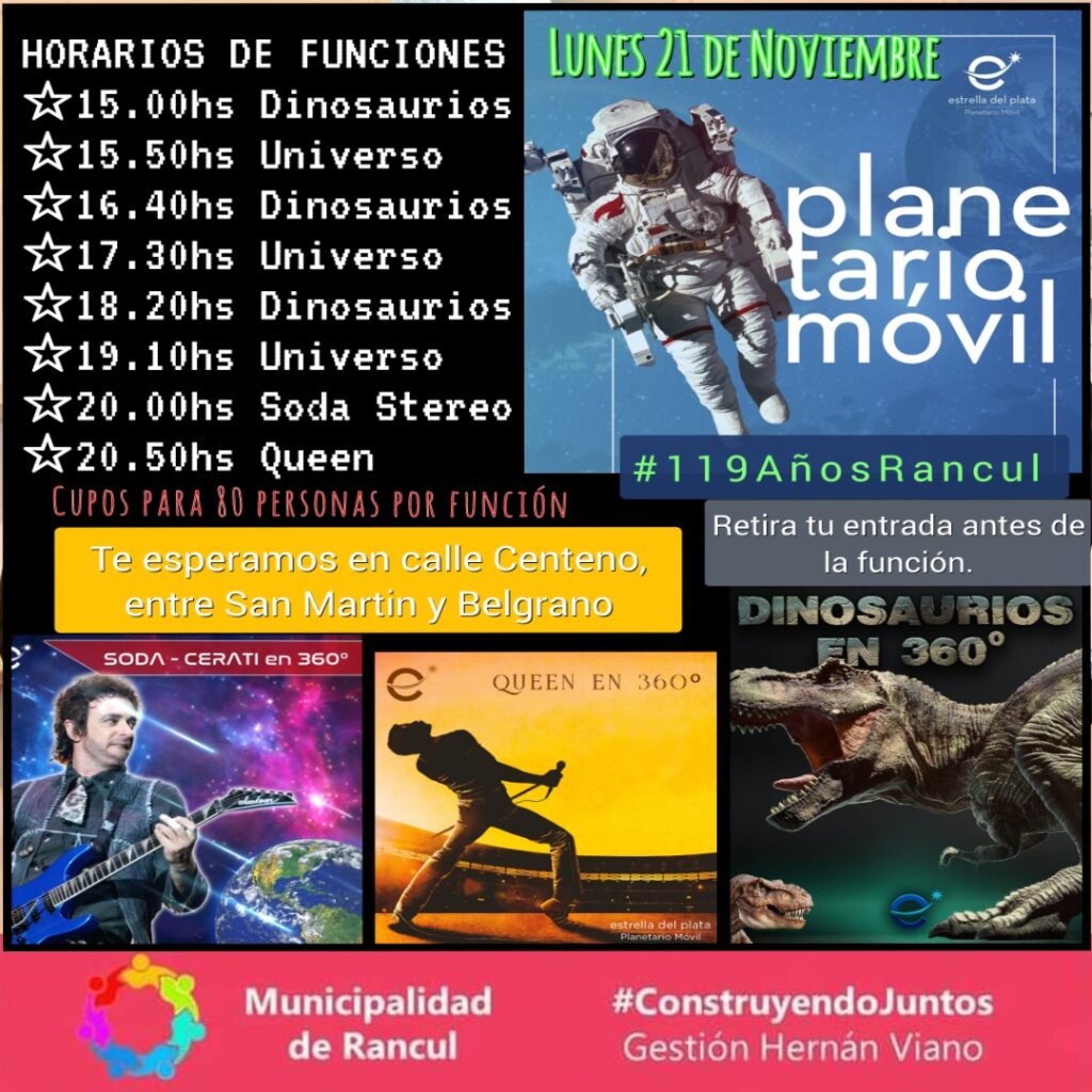 El programa de festejos cerrará el día lunes con una interesante propuesta como será la instalación del Planetario Móvil que dará la posibilidad de disfrutar dentro de un domo, la proyección en 360° del Universo, Dinosaurios y los shows de Queen y Soda Stereo.