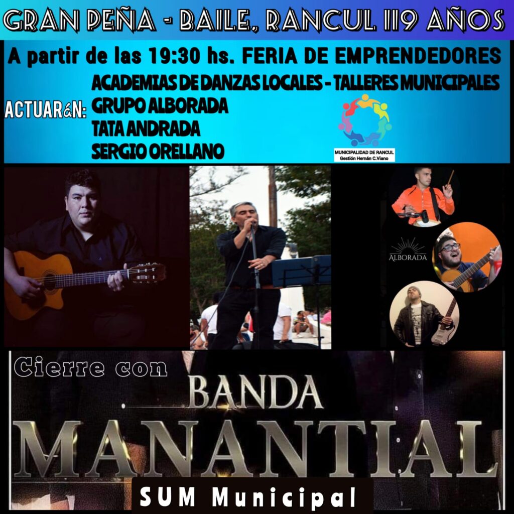 Por la tarde-noche comenzará además la peña programada en el marco de estos 119 años de Rancul. Será en el SUM Municipal y se espera la actuación de artistas locales como «El Tata» Andrada y el Grupo Alborada. Además se presentará el realiquense Sergio Orellano, academias de danzas y los talleres municipales. Cerrará la noche Banda Manantial.