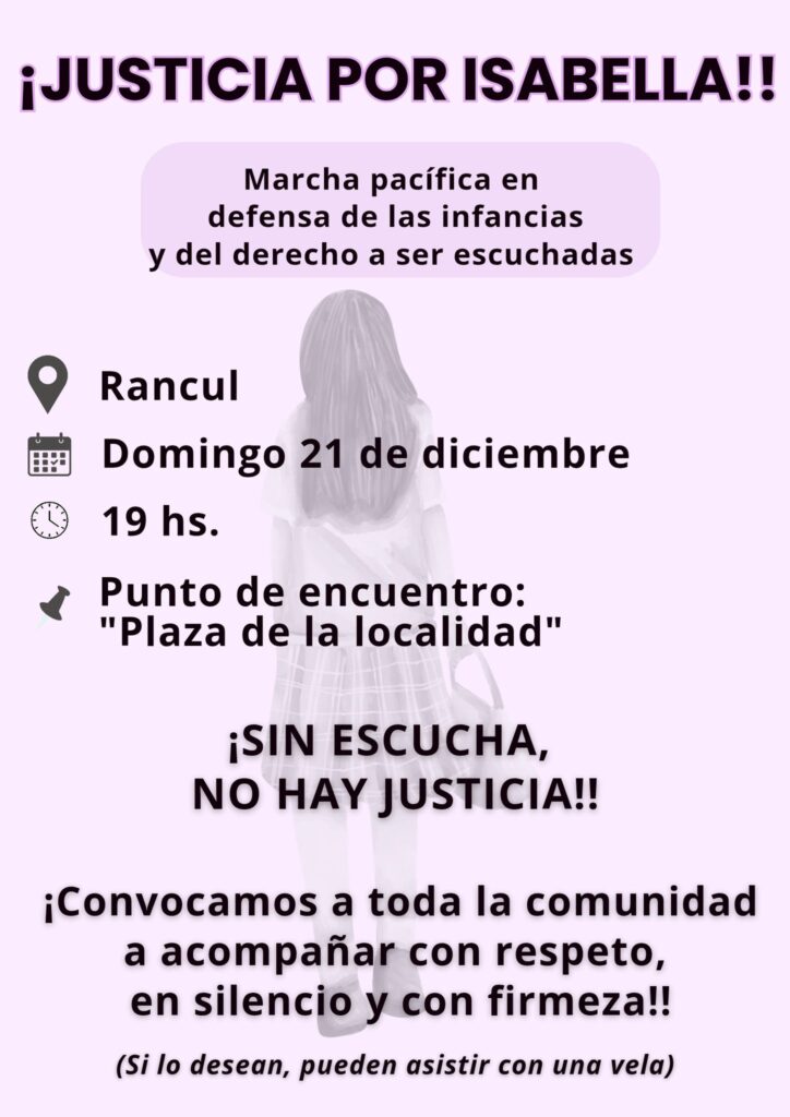 Este sábado comenzó a circular en redes sociales la convocatoria de Yanel Buffa y su familia que invitan los vecinos a ser parte una marcha para este domingo 21, en la plaza de Rancul. La cita para quienes quieran sumarse al pedido de la familia es a la hora 19:00 «para acompañar y defender el derecho de las infancias a ser escuchadas».