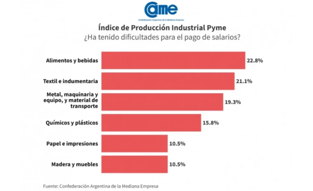 Según los datos actualizados que dio a conocer la Confederación Argentina de la Mediana Empresa (CAME), el 16,7% de las pymes industriales reportaron complicaciones para cumplir con los sueldos del mes en curso.