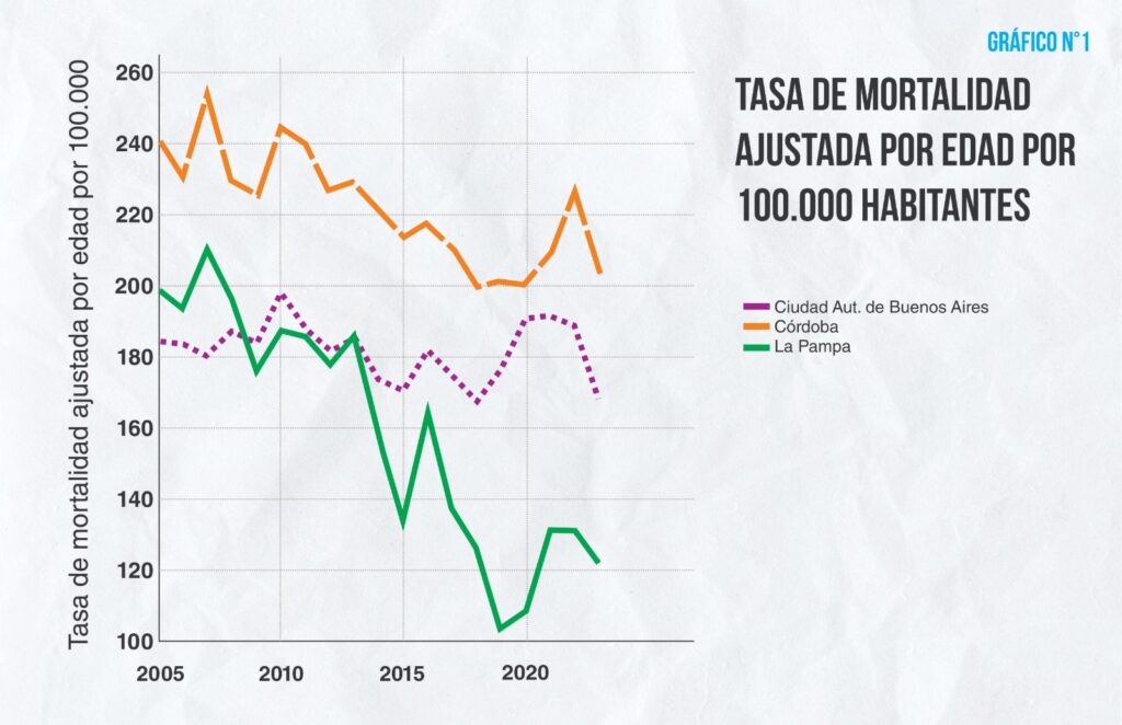 Según datos oficiales del Ministerio de Salud de la Nación, La Pampa logró reducir la mortalidad por enfermedades del sistema circulatorio de 198,2 por cada 100.000 habitantes en 2005 a 103 en 2019, una baja del 48% que supera ampliamente los avances registrados en jurisdicciones como CABA (184 a 176 un descenso del 4%) y Córdoba (240 a 200 una disminución del 17 %). (Gráfico 1).