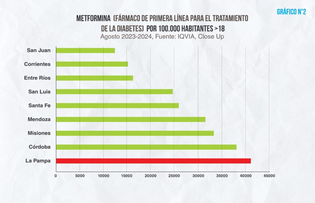 Un relevamiento interprovincial realizado en 2024 mostró que La Pampa lidera el acceso efectivo en farmacias al medicamento principal para la diabetes, clave para prevenir complicaciones cardíacas y cerebrovasculares (Gráfico 2). En este sentido el especialista ponderó a La Pampa. “El desafío es no sentarse en transitorios laureles y reimpulsar la inversión en salud con participación comunitaria”, advirtió.