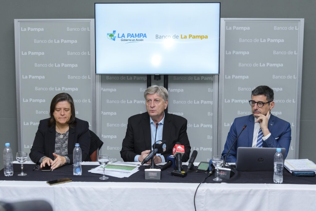 El gobernador de la provincia Sergio Ziliotto, junto al presidente del Banco de La Pampa, Alexis Iviglia y la ministra de la Producción Fernanda González, encabezo los rueda de prensa en la que se informaron las nuevas medidas que incluyen, además, el aumento de reintegro de compras por rubro.
