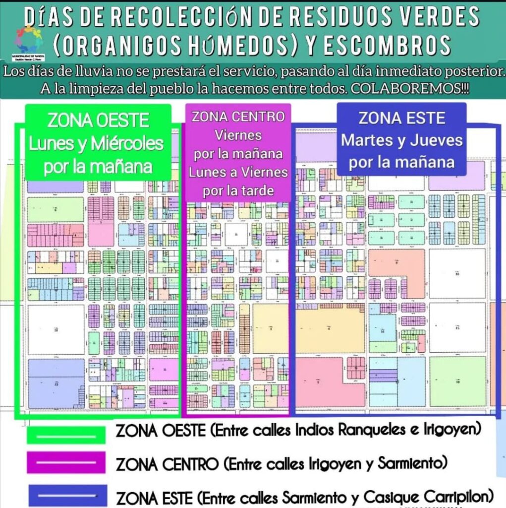 Además, se difundió un nuevo cronograma de Recolección de Residuos Verdes (ramas, hojas, pasto) y Escombros, solicitando que se respeten los días para sacar los mismos, dado que el ejido fue dividido en tres sectores que se recorrerán en días específicos.