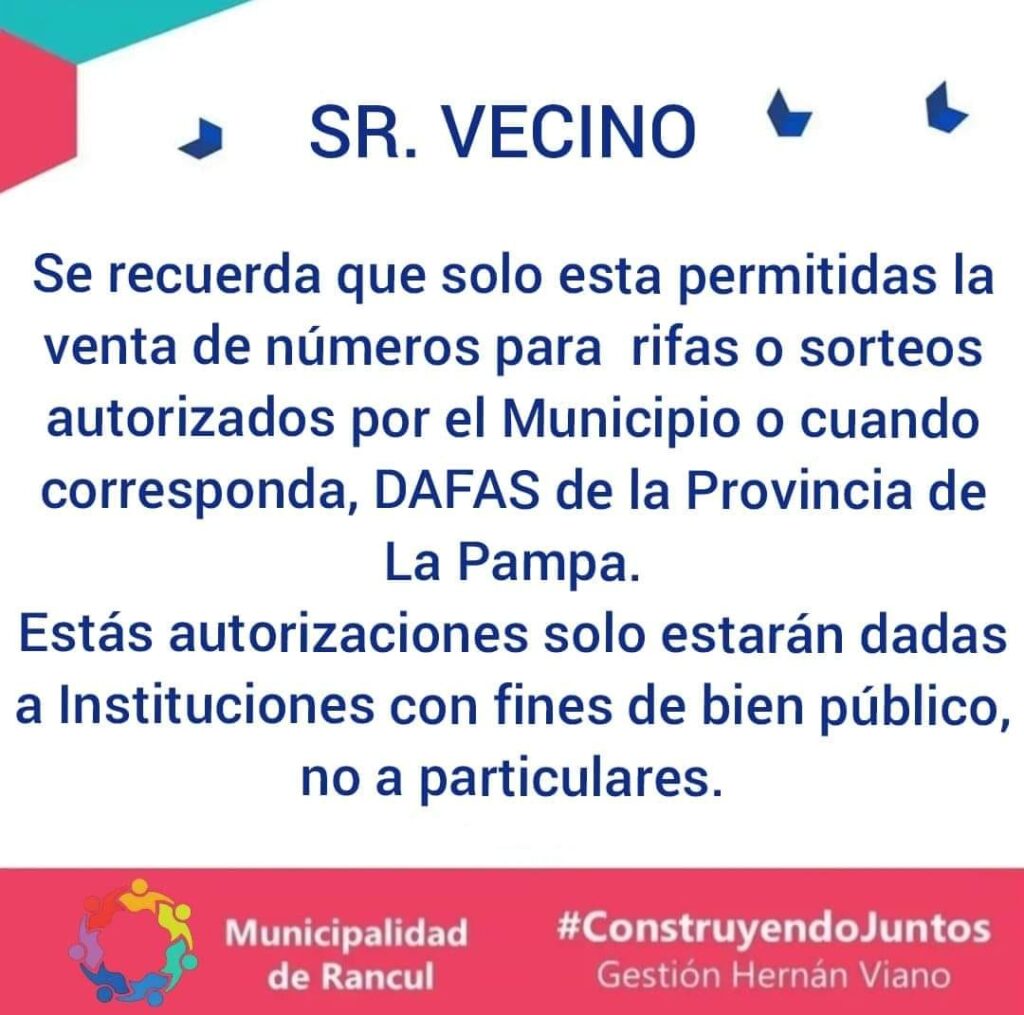 En la mañana de este jueves el municipio emitió un comunicado recordando a la comunidad que «solo esta permitida la venta de números para rifas o sorteos autorizados por el Municipio o cuando corresponda, DAFAS de la Provincia de La Pampa». En el mismo escrito además se precisó que «estas autorizaciones solo estarán dadas a Instituciones con fines de bien público, no a particulares».