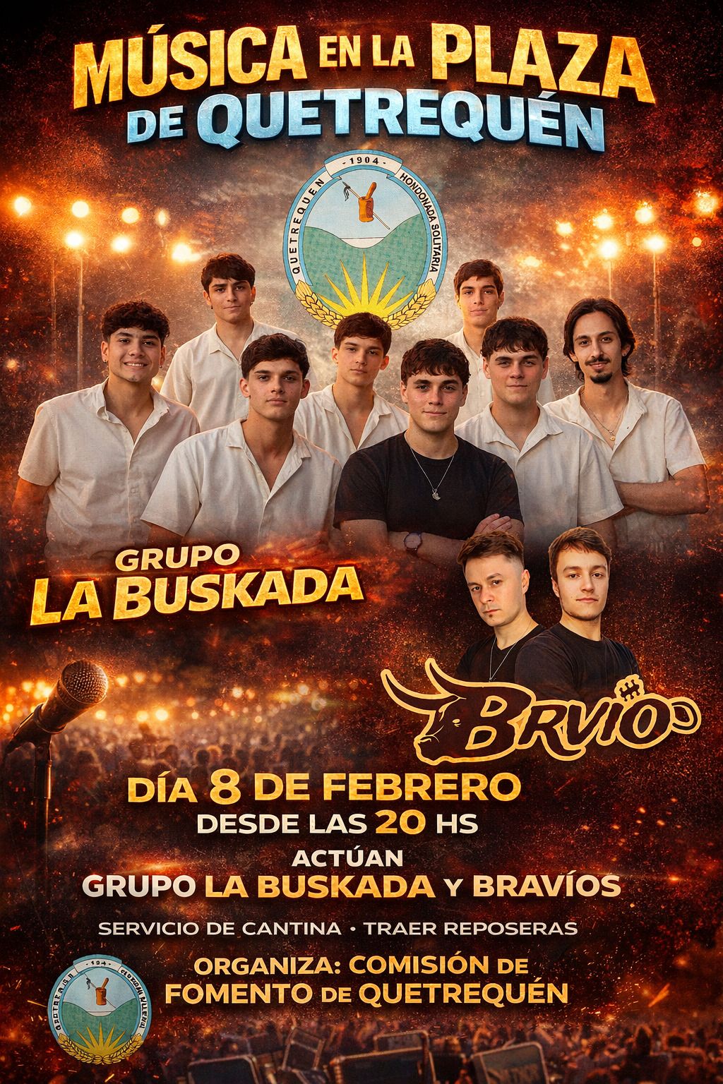La propuesta iniciará a la hora 20:00 en la plaza de la localidad de Quetrequén donde los vecinos de la zona podrán disfrutar de la música del grupo «La Buskada» y «Bravío».