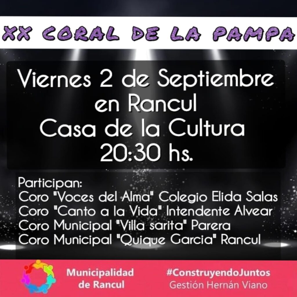 El XX Coral de La Pampa será con entrada libre y gratuita, organizado por el área de Cultura de la Municipalidad de Rancul, y se invita a concurrir a la comunidad para ser parte de este encuentro que convoca a los coros de la región.