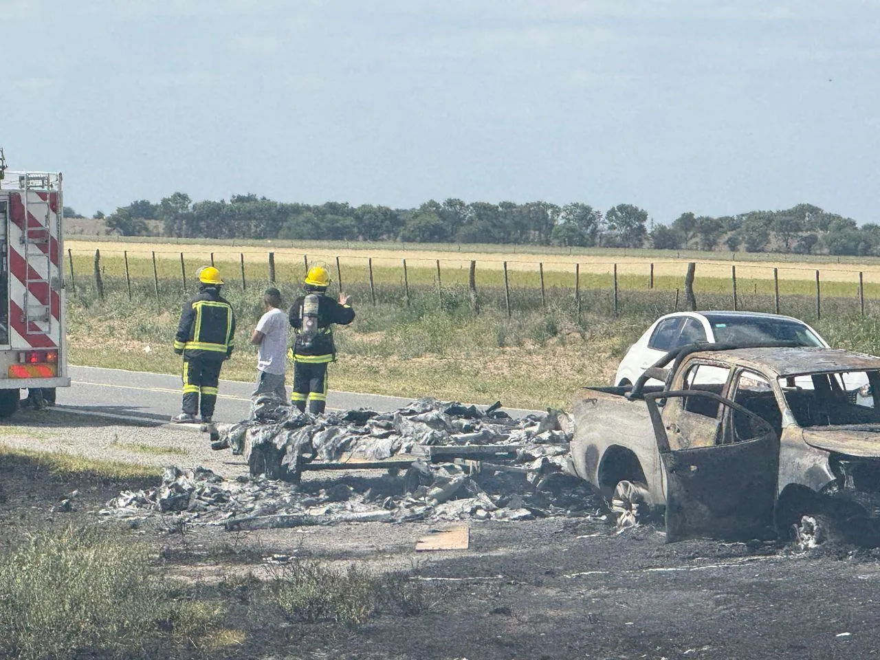 Un grave incidente vial se registró esta tarde en la Ruta Nacional 35, en el tramo comprendido entre Winifreda y Santa Rosa, donde un vehículo, su carro y la carga que transportaba quedaron reducidos a cenizas. El incendio, que se inició cerca de las 15:00 horas, provocó pérdidas materiales totales.