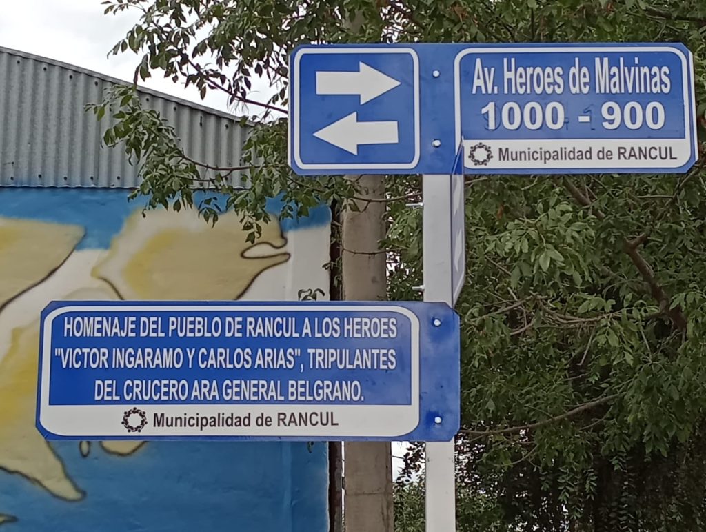 Durante el acto además se hizo mención a la colocación de cartelería que ya puede verse en el nomenclador de acceso a Rancul, donde se colocó una placa que reza: «Homenaje del pueblo de Rancul a los Héroes Víctor Ingaramo y Carlos Arias, tripulantes del Crucero ARA General Belgrano«.