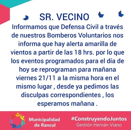 En horas de la mañana de este jueves además, desde el municipio se informó la decisión de posponer los eventos programados para la tarde, dado que el norte pampeano se encuentra bajo alerta amarillo por vientos fuertes.