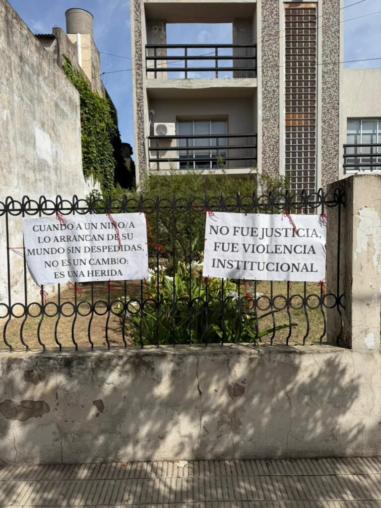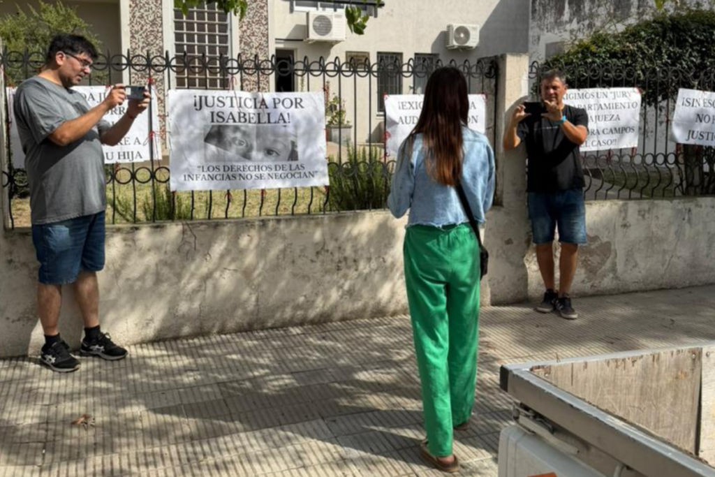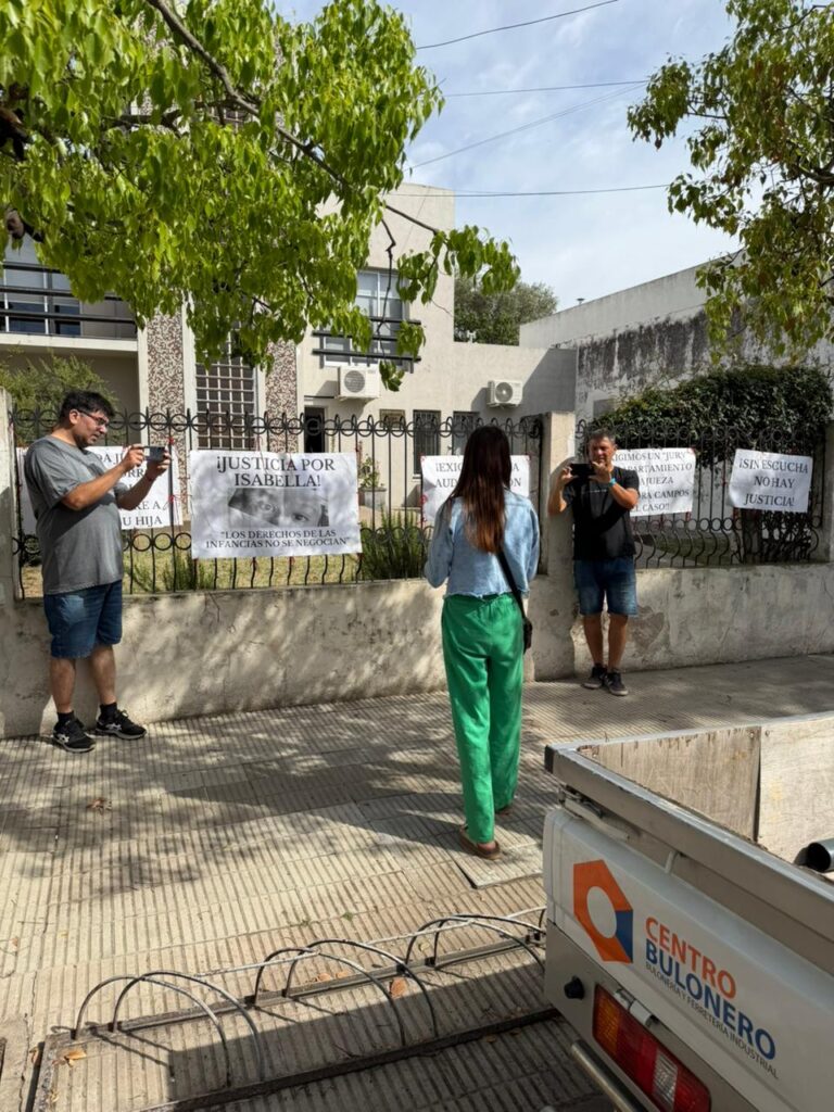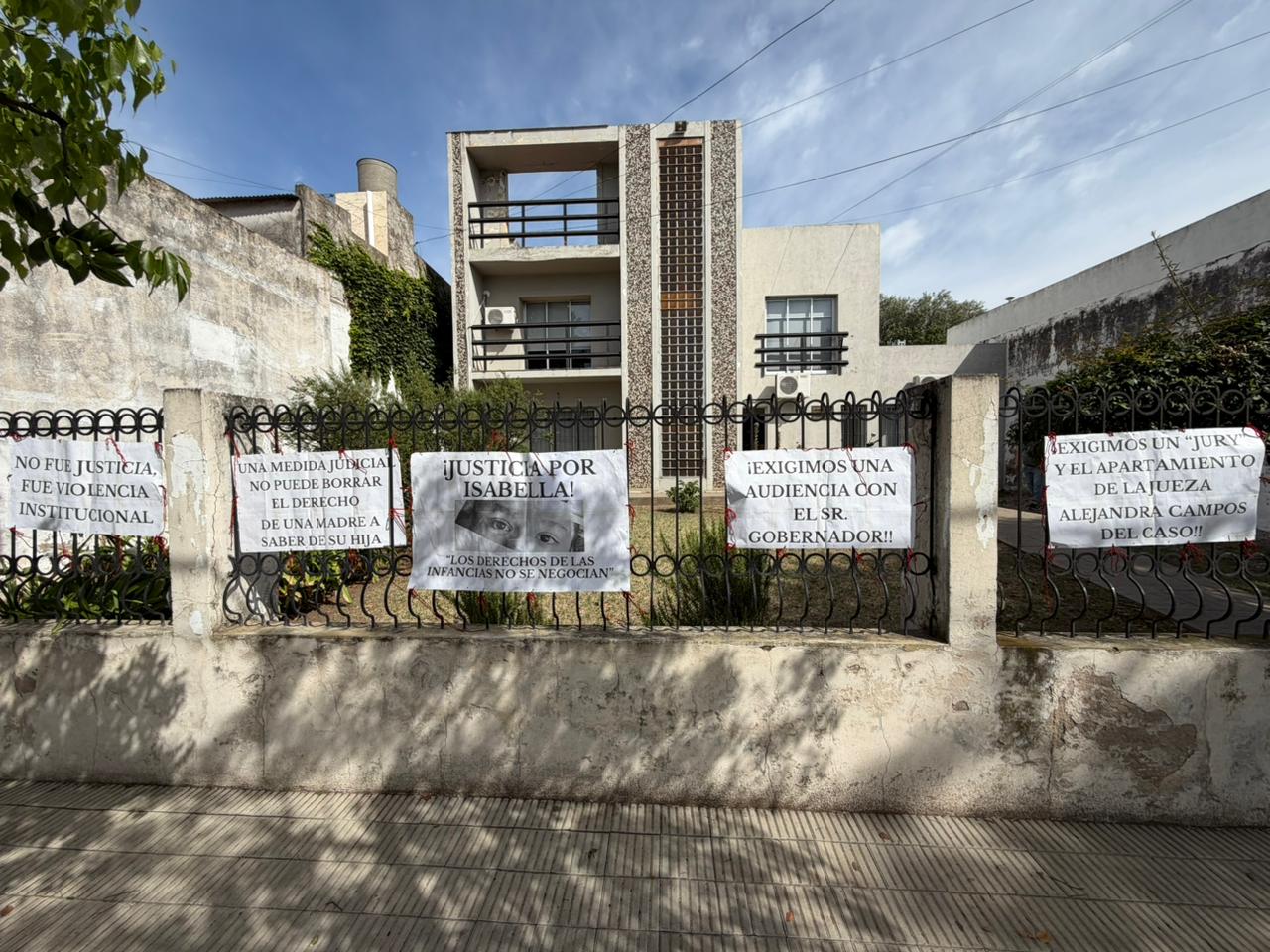 Con carteles pegados en las rejas del Juzgado y acompañada por un grupo de familiares y amigos que se manifestaron de manera pacífica pero firme, Yanel apuntó directamente contra la Dra. Alejandra Campos. El reclamo es claro: la restitución de su hija Isabella y el pedido de un Jury de Enjuiciamiento para la magistrada.