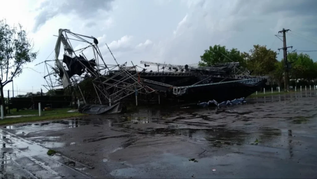 Acorde a lo informado a La Arena por el coordinador de Cultura Ariel Rodríguez, al parecer hubo una fuerte lluvia, con granizo y hasta una especie de “cola de tornado”, lo que provocó los destrozos mencionados. Es que la tarde estaba muy calurosa y “pesada”, y en poco tiempo se vino con todo el viento, el granizo y la lluvia, volando literalmente el escenario y parte de los stands preparados para los artesanos.