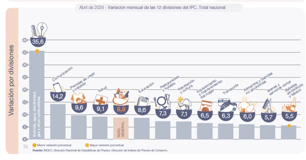La división de mayor aumento en el mes fue Vivienda, agua, electricidad, gas y otros combustibles (35,6%) por los incrementos en las tarifas de gas, agua y electricidad.