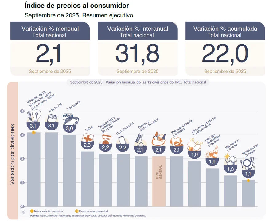 El Instituto Nacional de Estadística y Censos (INDEC) informó este martes que la inflación de septiembre de 2025 fue del 2,1%