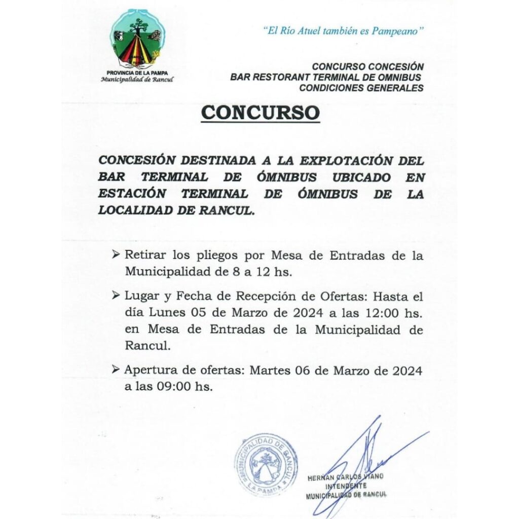 Ésta semana, la Municipalidad de Rancul dio a conocer el llamado a concurso por la concesión del Bar-Restaurante de la Terminal de Ómnibus.