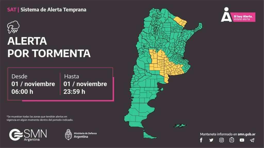 Además, bajo el alerta de nivel amarillo también se difundió que «se estiman valores de precipitación acumulada entre 25 y 50 mm, pudiendo ser superados en forma local».