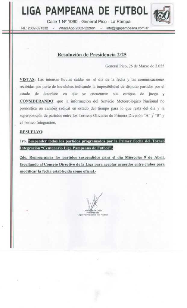 La fecha que estaba programada para este miércoles y con la cuál daría inicio el Torneo Integración de la Liga Pempeana, fue suspendida en horas de la mañana dadas las persistentes precipitaciones.