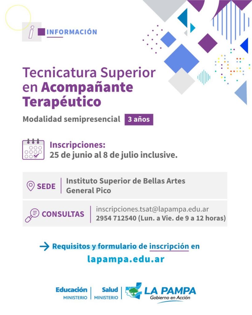 A partir de una iniciativa conjunta entre los Ministerios de Educación y Salud del Gobierno provincial, se implementará la Tecnicatura Superior en Acompañamiento Terapéutico en el Instituto Superior de Bellas Artes de General Pico, bajo la modalidad de cursada semipresencial y con una duración de tres años.