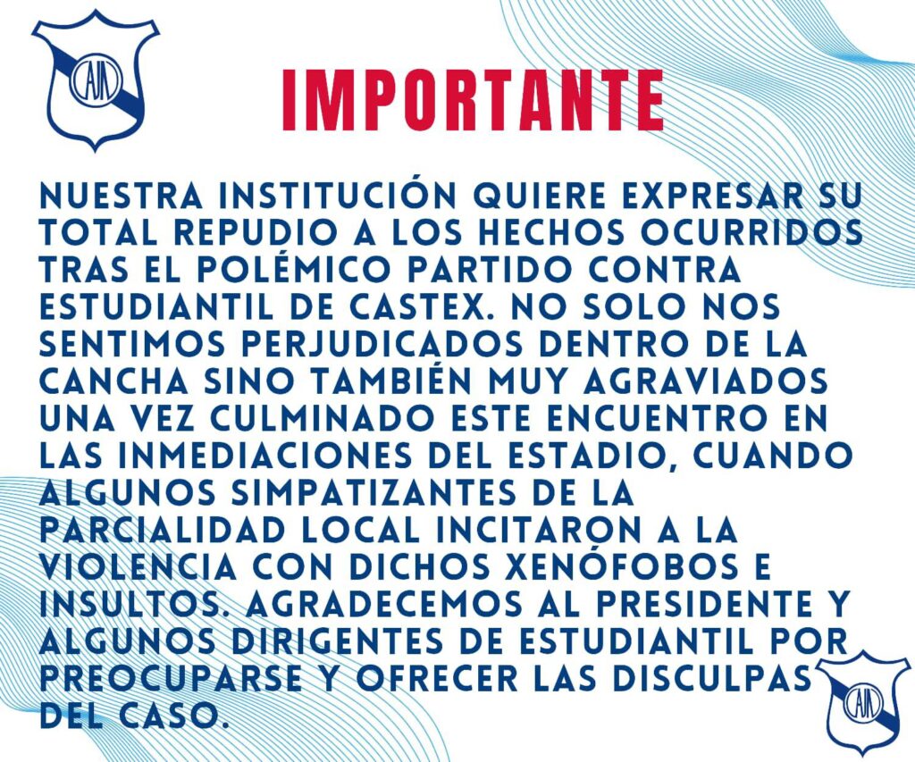 En horas de la noche de ayer y tras el regreso de los hinchas del Club a Rancul, la Comisión Directiva de Jorge Newbery emitió un comunicado repudiando lo ocurrido tras la culminación del partido ante Estudiantil de Eduardo Castex.