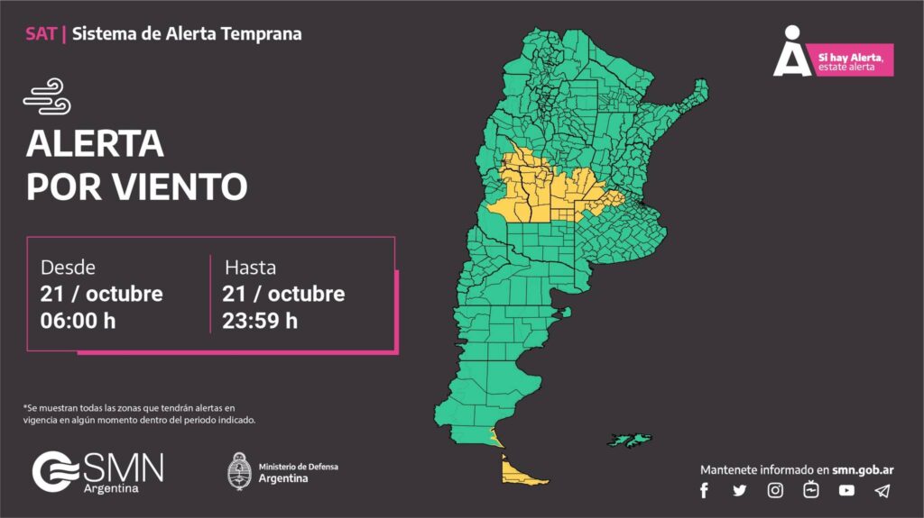 En tanto, rigen alertas amarillas por vientos en las localidades sanjuaninas de 25 de Mayo, Angaco, Caucete, San Martín, Valle Fértil, 9 de Julio, Albardón, la capital, Chimbas, Rawson, Santa Lucía y las zonas bajas de Pocito, de Rivadavia y de Sarmiento.