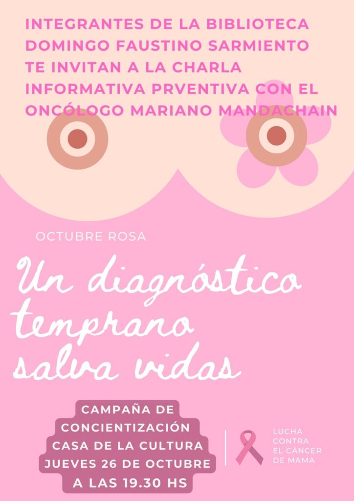Desde la Biblioteca Popular «Domingo Faustino Sarmiento» se anunció una charla en el marco del «Octubre Rosa», un mes que fue establecido por la Organización Mundial de la Salud como el “Mes de concientización sobre Cáncer de Mama».