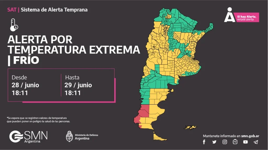 Se trata de un alerta amarillo que alcanza a toda la provincia de Buenos Aires menos la costa; y a zonas de Santa Fe, Entre Ríos, Corrientes, Santiago del Estero, Jujuy, Tucumán, Catamarca, La Rioja, San Juan, Mendoza, Córdoba, San Luis, La Pampa, Neuquén, Chubut, Santa Cruz y Tierra del Fuego.
