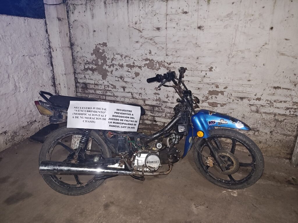En el informe policial se detalló que si bien en el rodado se constató que en el motor los números coincidían con la cédula exhibida y que el chasis no presentaba numeración visible, también se identificaron irregularidades: «se observaron cortes, soldaduras, refuerzos y modificaciones de tipo casero en distintos sectores del cuadro, motivando a su vez al secuestro judicial bajo una causa por encubrimiento con intervención del Ministerio Público Fiscal, a cargo del Dr. Juan Marcelo Cupayolo».