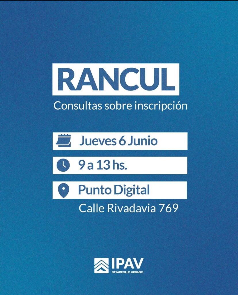 Este jueves arribará a Rancul personal del Instituto Provincial Autárquico de Vivienda. Estarán atentiendo en el Punto Digital, ubicado en la calle Rivadavia 769, en el horario de 9:00 a 13:00.