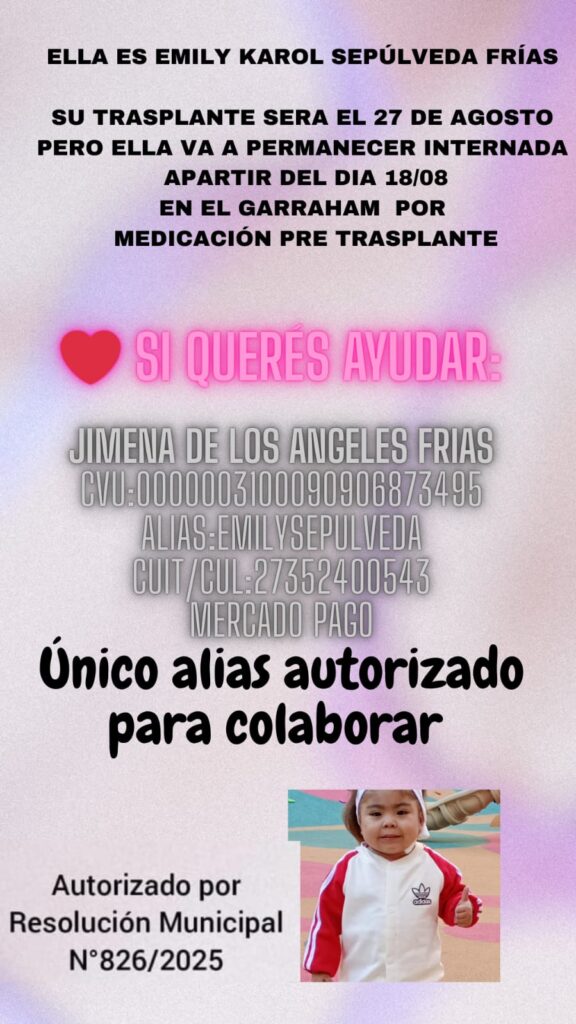 Según se difundió en las redes, la familia se encuentra solicitando colaboración de quienes puedan ayudar para solventar gastos en la ciudad de Buenos Aires, donde permanecen desde hace seis meses cuando la pequeña y su mamá viajaron para que Emily recibiera tratamientos médicos de complejidad.