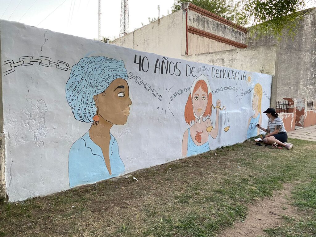 La joven artista plástica contó además que desde el «Club de Mentes» cuentan con un programa televisivo donde «hablamos sobre diferentes temas y hacemos intervenciones urbanas. La idea era hablar sobre los 40 años de democracia y hablar sobre esta fecha tan importante, entonces quisimos hacer un mural. Con Sebastián Rojo veníamos hablando, ya hicimos uno el año pasado acá, y consideramos que era algo muy bueno hacerlo de nuevo».