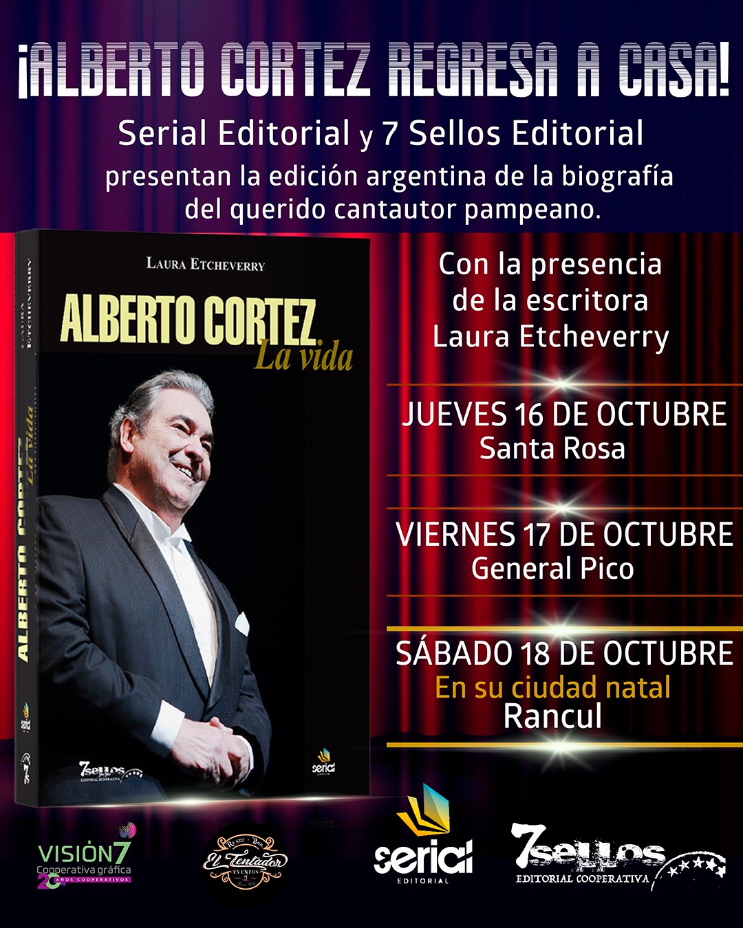 Las editoriales «Serial Editorial» y «7 Sellos Editorial Cooperativa» anunciaron la presentación oficial del libro “Alberto Cortez, La vida”, de la autora Laura Etcheverry, en tres localidades de la provincia de La Pampa, entre ellas en su lugar natal: Rancul.