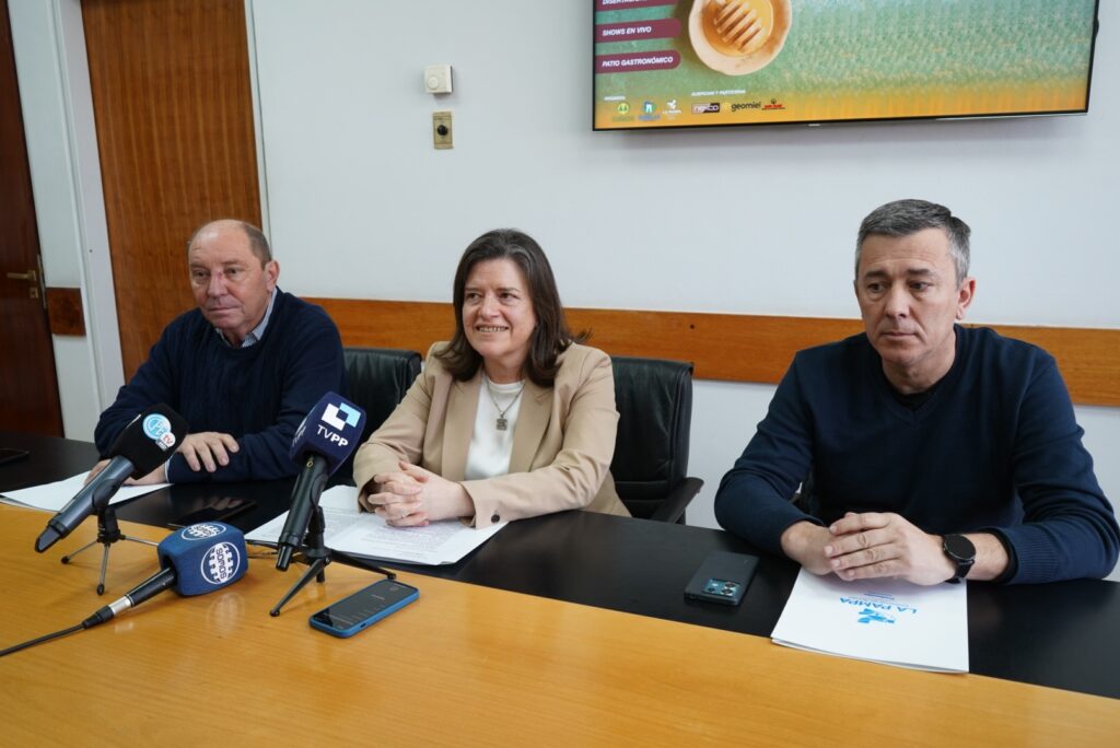 La ministra de la Producción, Fernanda González; el intendente de Doblas, Darío Monsalvo; y el presidente de la COSEDO, Jorge Páez anunciaron hoy la realización de la 27° edición de la Expo Apícola Doblas 2024. Los presentes coincidieron en destacar la importancia de la actividad apícola, tanto en la localidad de Doblas como en el resto de la Provincia.