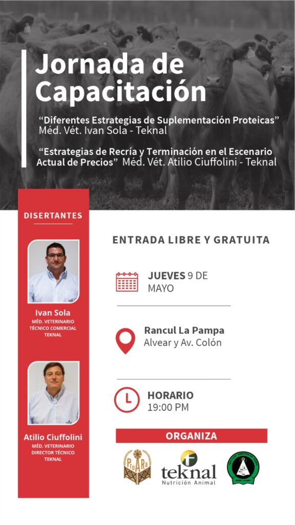 En esta oportunidad disertarán profesionales de la empresa de nutrición animal, Teknal, que arribarán a nuestra localidad para exponer sobre dos temáticas: «Diferentes Estrategias de Suplementación Proteica» y «Estrategias de Recría y Terminación en el escenario actual de precios».
