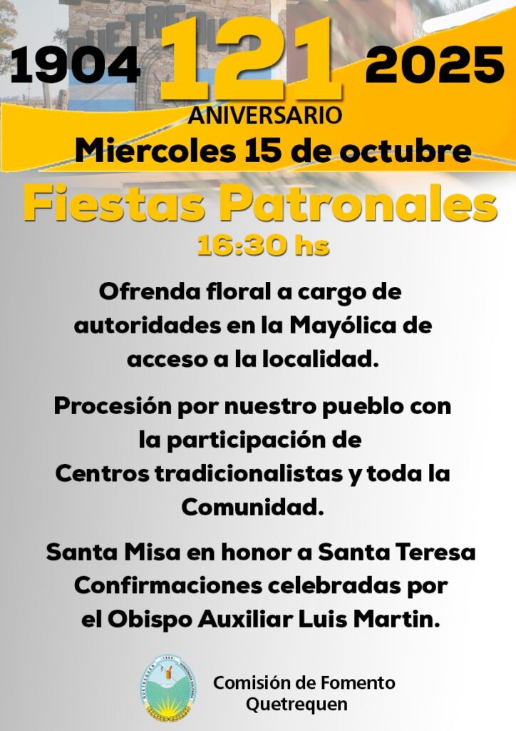 Quetrequén conmemora hoy su 121° aniversario y lo celebrará con las tradicionales fiestas patronales en honor a Santa Teresa de Ávila, patrona de la localidad.