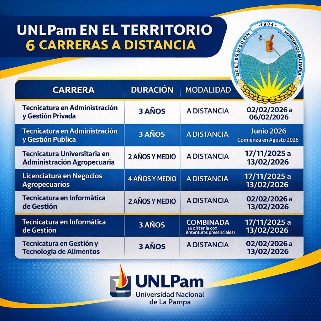 Así lo comunicó la Comuna que dirige Juan Pablo Ressio. Desde la Comisión de Fomento precisaron que se adhirió al programa lanzado entre la Universidad y el Gobierno de La Pampa en el mes de diciembre de 2025 con el cuál se busca extender la oferta de carreras a distancia de la Universidad Nacional de La Pampa a todas las localidades y comisiones de fomento, fortaleciendo el acceso a la educación superior en cada rincón de la Provincia.