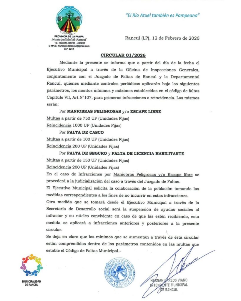 Mediante una circular emitida en el día de hoy, la Municipalidad de Rancul informó a los vecinos que se aplicarán fuertes multas por infracciones a los conductores de motocicletas, sobre todo a aquellos que realicen maniobras peligrosas o utilicen escapes libres. Las multas en este caso inician en el millón de pesos.