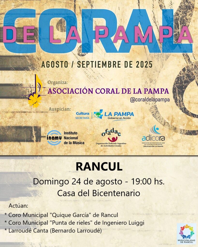 La XXIII Edición del Coral de La Pampa, que fue anunciada días atrás desde la Secretaría de Cultura de la provincia, contará este año con 32 presentaciones que tendrán lugar en 30 localidades de la provincia, durante los meses de agosto y septiembre. Este fin de semana, las fechas se concretarán en Parera y en Rancul.
