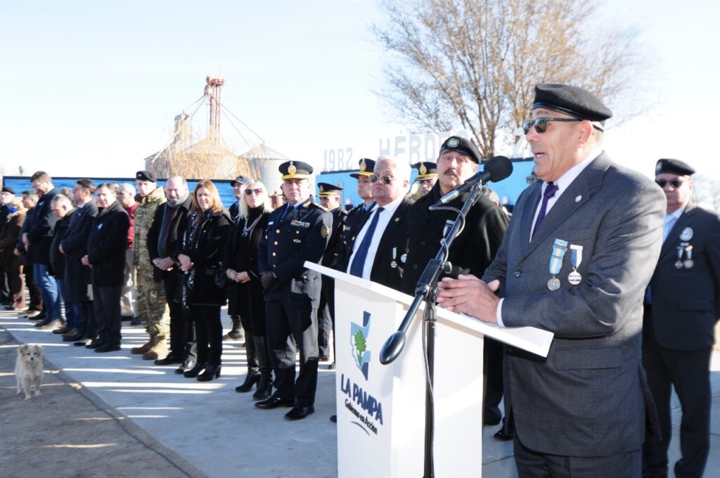 Seguidamente habló a los presentes Rolando Contreras, presidente del Centro de Veteranos de la provincia de La Pampa, quien luego recibió dibujos por parte de la estudiante local Maia Páez. También se dirigieron al público el jefe comunal y el subsecretario de Derechos Humanos. El intendente entregó una plaqueta tanto al Centro de Veteranos como al Gobierno de La Pampa y luego del retiro de las banderas de ceremonia se procedió con la entrega de medallas a veteranos, para culminar con un desfile militar.