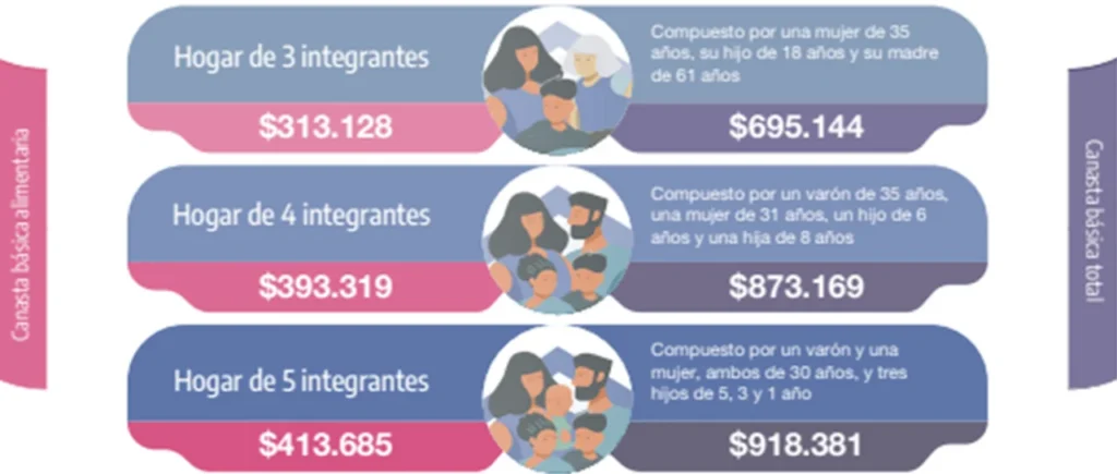 En caso de un hogar de 5 integrantes, una pareja y tres menores, el ingreso mínimo para no ser indigente es de $416.685 mientras que para estar por encima de la línea de la pobreza deberá ser mayor a $918.381