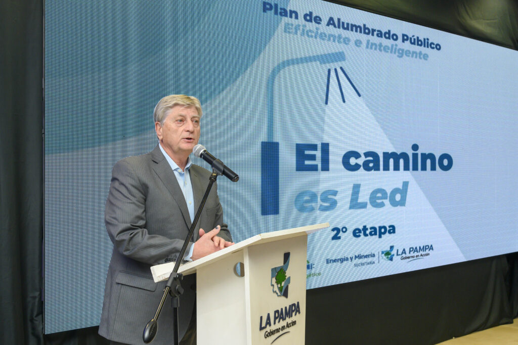 El gobernador, junto al intendente de Macachín, Martín Mujica; el  secretario de Energía y Minería, Matías Toso; demás funcionarios provinciales y municipales e integrantes de cooperativas de la zona encabezó el acto de entrega de 1.599 lunarias LED a nueve localidades, en el marco de la segunda etapa del Plan de Alumbrado Público Eficiente e Inteligente