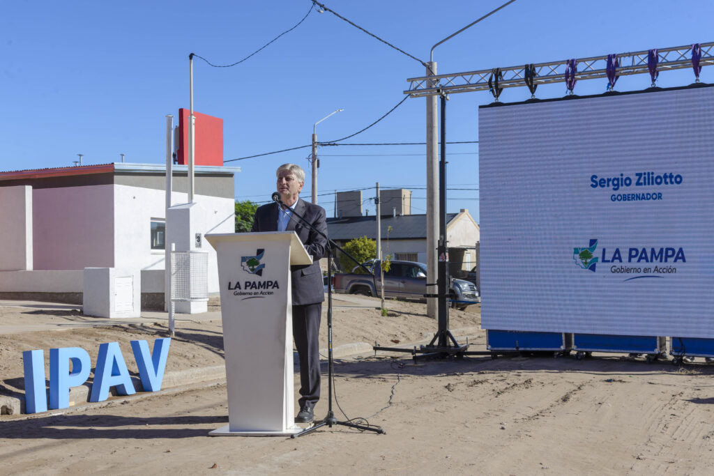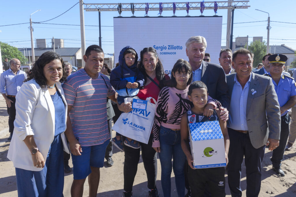 El gobernador Sergio Ziliotto encabezó este jueves el acto de entrega de 39 viviendas del plan «Mi Casa» y de servicios en General Acha; y recorrió las obras de la Travesía Urbana y la infraestructura vial y de desagües pluviales en el barrio del oeste.